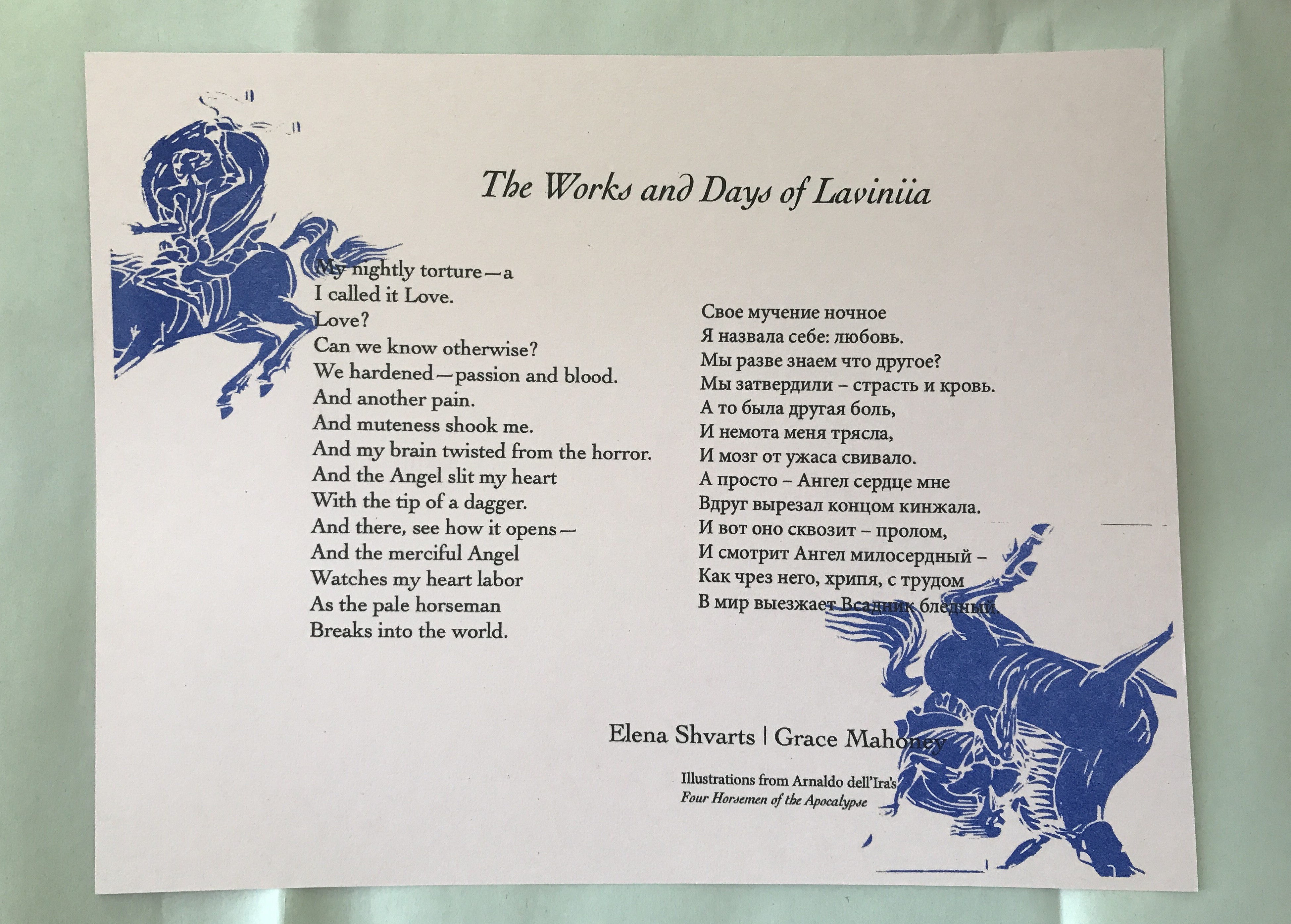 Emily Goedde and Meg Berkobien founded the Graduate-Student Translation Workshop at the University of Michigan in 2013. The Workshop was inspired by the fact that, although we work with materials from different periods and continents, we would benefit from the ability to discuss practical and theoretical issues raised by translating literary texts with our peers on a regular basis.